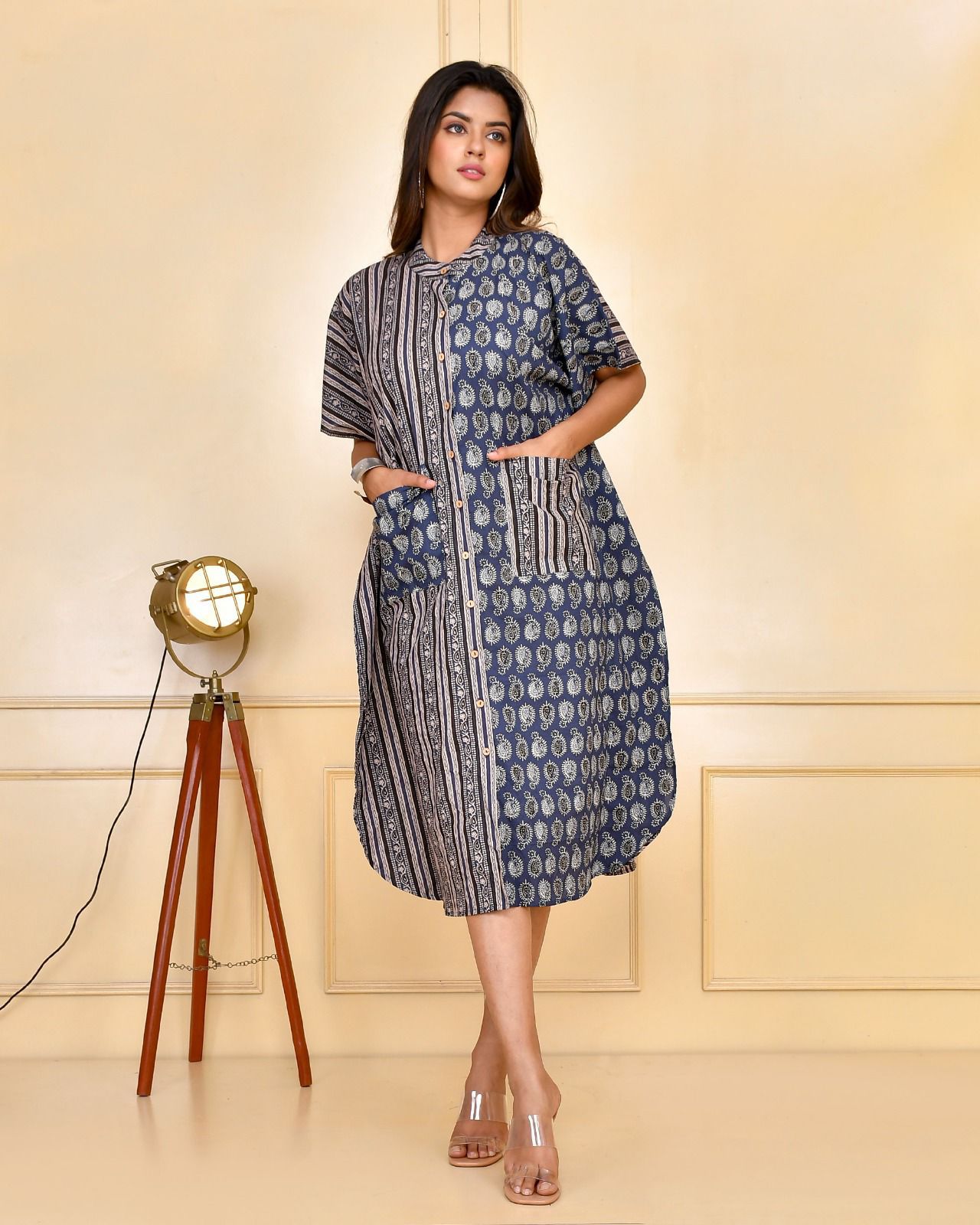 Embrace elegance and comfort with this Blue Printed Kaftan Dress, perfect for a laid-back yet stylish look. This kaftan features an eye-catching blend of intricate paisley and stripe patterns, adding a unique twist to traditional design. Crafted from breathable fabric, it ensures all-day comfort, making it ideal for both lounging at home or a casual day out.